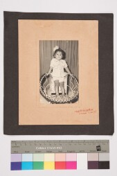 Mount pasted on a black sheet. Studio solo portrait, full-length shot of a baby wearng shirt, flowers, standing on a woven wired chair and facing…