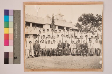 Outdoor portrait. Sepia tone. Full length shot. Group portrait. There are 3 rows of 41 men. 12 are sitted and they are wearing shirt pant coat, tie…