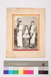 Mildly deteriorated print. Studio group portrait, full-length shot image of 2 women wearing saree, adorned with jewels and flowers, holding books…