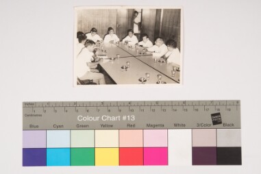 Indoor group portrait, full-length shot image of 9 men, most of them wearing shirt and pants, sitting around a table