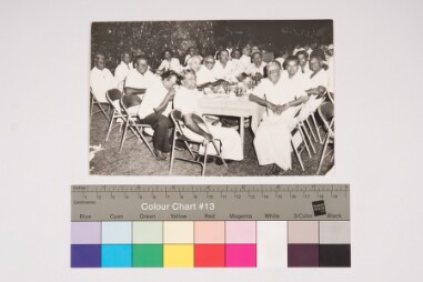 Outdoor group portrait, full-length shot image of more than 20 men sitting around table. Some wearing shirt and veshti and some in shirt and pants…