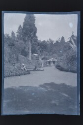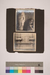 Outdoor portrait. There are 2 images on the album sheet of temple sculptures.