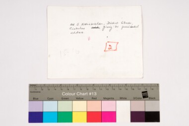 Studio portrait. Back of the print, mentionning "MR. S. Narasimhan, District Collector, Coimbatore, giving his presidential address".…