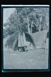 Outdoor photograph, long shot image of a hut house on a garden and a man sitting on a garden