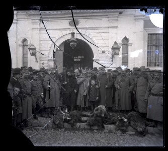 Hunting company from Bitola joined by a group of hunters from Belgrade (officers) with their catch (bears, boars etc.) On the photograph is Bitolian Kamir bey ( in the middle with fez). In front of the millitary school in Bitola.