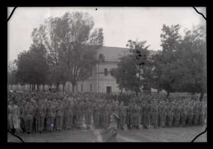 JNA soldiers lined up in front of the barracks during a military celebration.