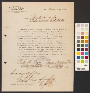 The letter, sent on January 10, 1920 from Lima by Pedro M. Reyes and Pedro Malpartida, secretary and president of the Society of Textile Workers Union “33 Amigos” , informs the President of the Student Federation of Peru about the recent renewal of positions in its Board of Directors, enclosing the list of the new members who will lead the society during the next period. In the message, they express their desire to further strengthen the ties of friendship and solidarity between both institutions, highlighting a sense of shared aspiration for progress and mutual cooperation.