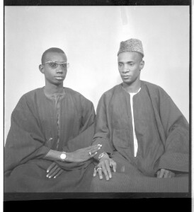 "Two men wearing boubous: one wearing a hat and the other wearing glasses, both sitting profile view in the studio."