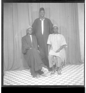 "Three men wearing boubous and hats, two of whom sitting full frontal view in the studio."