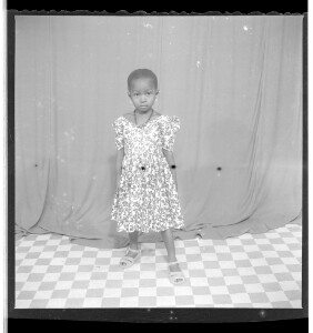 "A little girl wearing a dress and a necklace, standing facing forward in the studio."