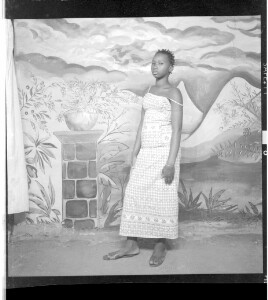 A girl wearing a robe pagne (wrapper dress) standing profile view in the studio