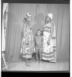 "A boy wearing a shirt and shorts, standing facing forward in between two women wearing dresses, headscarves, and necklaces, both standing profile view in the studio."