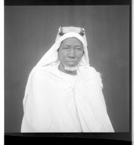 "An elderly man wearing a loose boubou and a headscarf, sitting profile view in the studio."