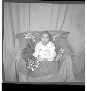 "An infant wearing a boubou, sitting facing forward on a chair, in the studio."