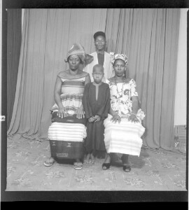 "An old man wearing a boubou and black fez standing in the back, a woman wearing a camisole, head wrap, and black and white pagne sitting in front, with a little boy wearing a black boubou standing in...