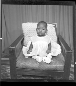 A baby wearing a white dress sitting face-forward in a chair in the studio