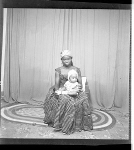 A woman wearing a dress and head wrap sitting face-forward with a baby in the studio