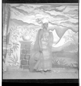"A girl wearing a dress and head wrap standing in profile in a studio decorated with clouds, flowers, and a flower pot on a little wall."