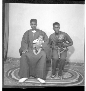 "Two men, one wearing a shirt and pants and the other wearing a boubou and hat, both holding a baby on their laps sitting face-forward in the studio."