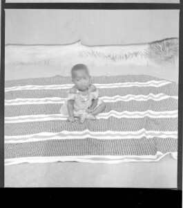 A baby sitting on a blanket on the studio floor (same baby from Image 04179)