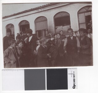 Views from settlements during the wars - Children - pupils in Macedonia. Group portrait, 3/4 figure, civilian clothing. An unidentified location. Black and white photo, 12 x 17 cm. Paper. Crushed. Original reference: BOX4; F73k_op1_ae2804_v069.