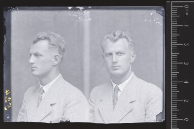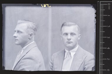 Silver gelatin on cellulose nitrate film negative with two separate portraits of the same man: the image on the left depicts a profile portrait,…