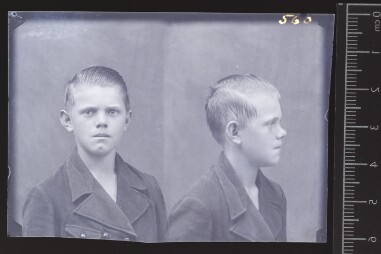 Silver gelatin on cellulose nitrate film negative with two separate portraits of the same child, the image on the left depicts a frontal portrait,…