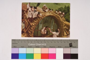 Post card colour photograph where a group of men are contructing a hut, All the men have covered themselves with white shawls, the hut is…