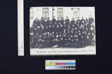 Group monochromatic photo is pasted on a thick sheet of cardboard. Participants of the Union of livestock state farms's congress of workers in…