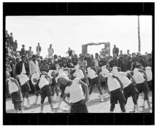 Students performing for Pashupati SJB Rana, Minister of Water Resources and Communication, in Sindhupalanchok. Photo by Kiran Man Chitrakar.…