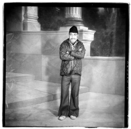 A man poses against a painted backdrop in Ganesh Photo Lab. A studio that was opend by Ganesh Man Chitrakar in early 1970s.
