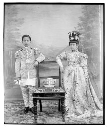 Prime Minister Mohan Shumsher J.B. Rana (ruled 1948-1951) with wife, Shree Teen HH Dikshya Kumari Devi, during his coronation in 1948. Photo taken by Ganesh Man Chitrakar