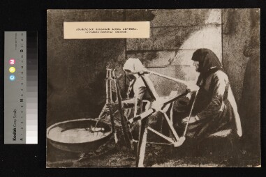 A photograph depicting 2 women reeling silk thread. Extent: 1 photograph. Size and dimensions of original material: Height 28.5cm, width 38.5cm.…