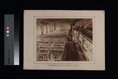 A photograph depicting people working at the looms in the factory interior. 140 is written on the negative. Extent: 1 photograph. Size and…