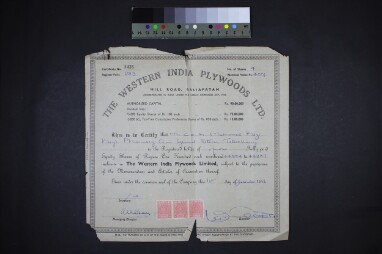 This is a share cerificate issued to C.O.K Muhammed Keyi of Thalaserry, who is holder of the share of Western India Plywoods Ltd, one of the major…