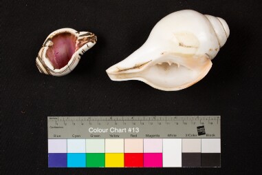 Two small conches. Extent: Two conches. Size and dimensions of original material: One 15 cm x 8.5 cm, the other 7.5 cm x 5 cm. Arrangement: All the…