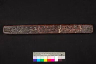 A wooden dough mould, carved with numerous figures and symbols: human and humanoid figures, astrological trigrams and symbols, nagas. The figures…