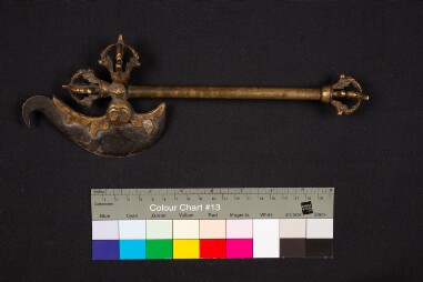 A ritual knife with curved blade and with vajra attachments. A tantric ceremonial symbolic weapon, a tool of the gods. Iron, bronze and wood.…