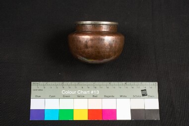 A copper bowl with brass rim used for cupping. A fire vessel heated to create suction on the skin, a technique of Tibetan medicine. Extent: One…