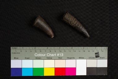 Two animal horn tips. Extent: Two animal horn tips.Size and dimensions of original material: 6.5 cm and 4,3 cm long.Custodial history: All items…